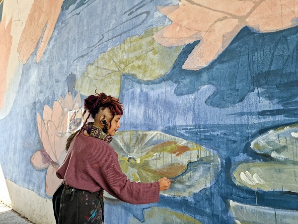 La prima opera faentina, No Mud, No Lotus, sta prendendo forma lungo il muro all’interno dell’accesso al parcheggio del centro commerciale Faenza 1. A realizzarla Kathrina Rupit, in arte KinMx, artista di origine messicana ma che vive e lavora a Dublino.