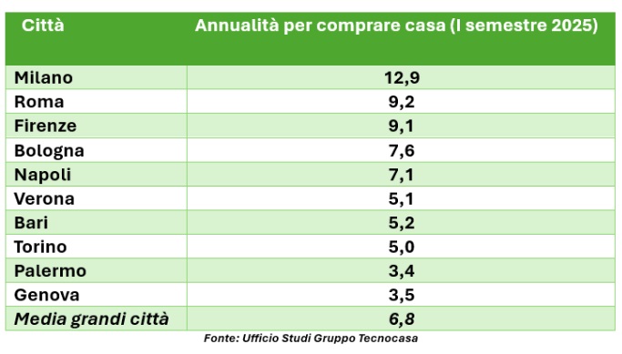 (Sesto Potere) – Bologna – 1 dicembre 2025 – Occorrono 6,8 annualità di stipendio per acquistare casa nelle grandi città nel primo semestre del 2025. Queste le conclusioni della ricerca condotta dall’Ufficio Studi del Gruppo Tecnocasa.