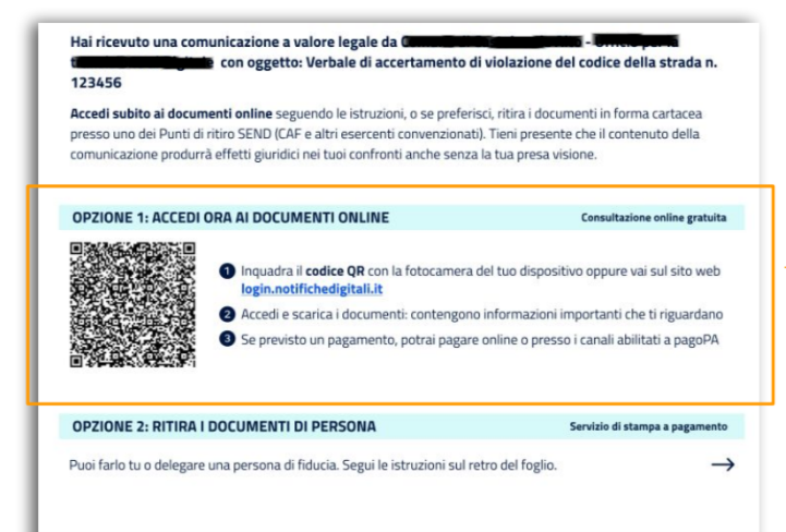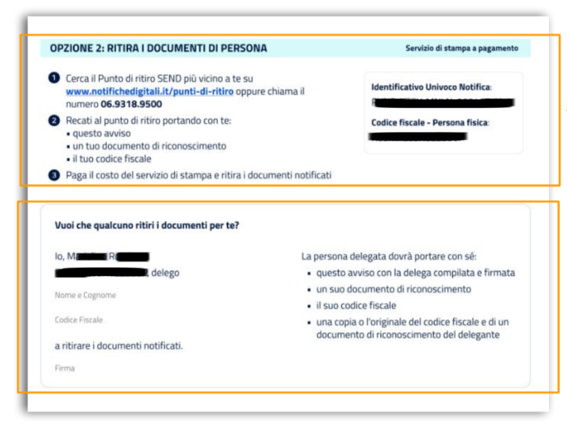 Se il destinatario non ha una PEC o non è registrato sulla piattaforma SEND, la notifica sarà gestita tramite invio di un avviso cartaceo con raccomandata postale. Questo avviso non conterrà l’atto intero, ma le istruzioni dettagliate (incluso un QR code) per accedere tramite SPID/CIE alla piattaforma SEND e visionare l’atto completo online o, in alternativa, per ritirarlo di persona presso i Punti di ritiro abilitati (come i CAF convenzionati), previo pagamento delle spese di stampa. È possibile delegare un soggetto diverso al ritiro della copia cartacea del documento notificato tramite SEND compilando l’apposito spazio dedicato presente nell’avviso cartaceo ricevuto.