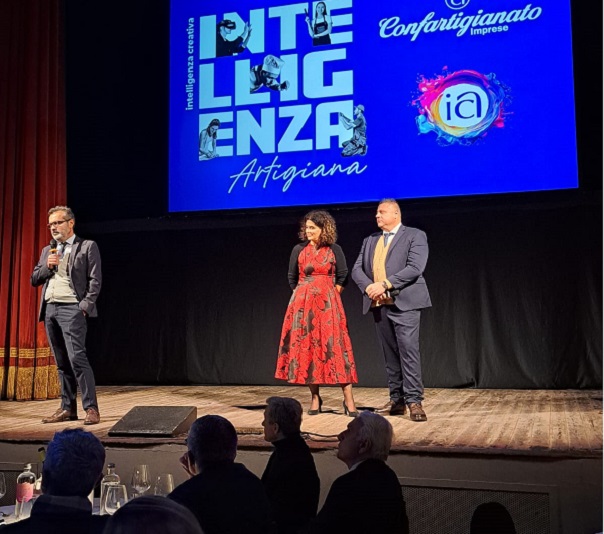 Sul palco del teatro Verdi (nella foto: i presidenti e il segretario Stefano Bernacci) ha campeggiato la scritta Intelligenza artigiana, il cuore del made in Italy nell’era digitale.