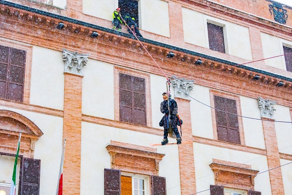 Nonostante la necessaria rimodulazione del programma, in Piazza Saffi erano presenti famiglie e bambini per assistere a uno dei momenti più attesi: l’arrivo della Befana, che si è calata dal Palazzo Comunale distribuendo caramelle ai presenti. Una Befana immersa nella neve, scesa per l’occasione sullo snowboard e protagonista di una scena di rara suggestione che ha regalato alla città una vera magia collettiva.
