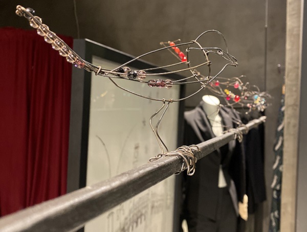 Un disegno appeso in tutta la sua semplicità e allo stesso tempo nella sua fierezza, evidenziata ancora di più dal gioco di fili di ferro che crea figure e movimento nell’installazione di Alessandro Rizzi. Il Filo da torcere che crea passerotti allegri a cornice dell’opera.
