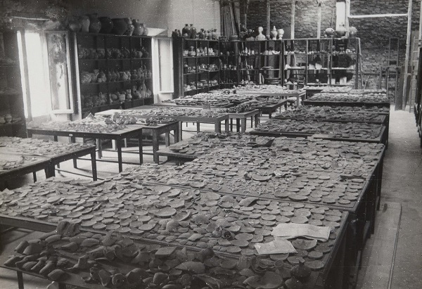 Nella foto in bianco e nero il recupero dalle macerie dei frammenti delle ceramiche della collezione MIC Faenza dopo il bombardamento del 13 maggio del 1944.