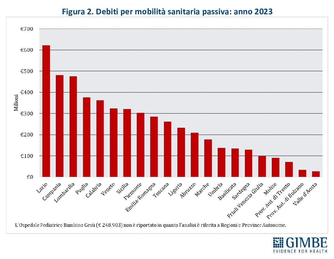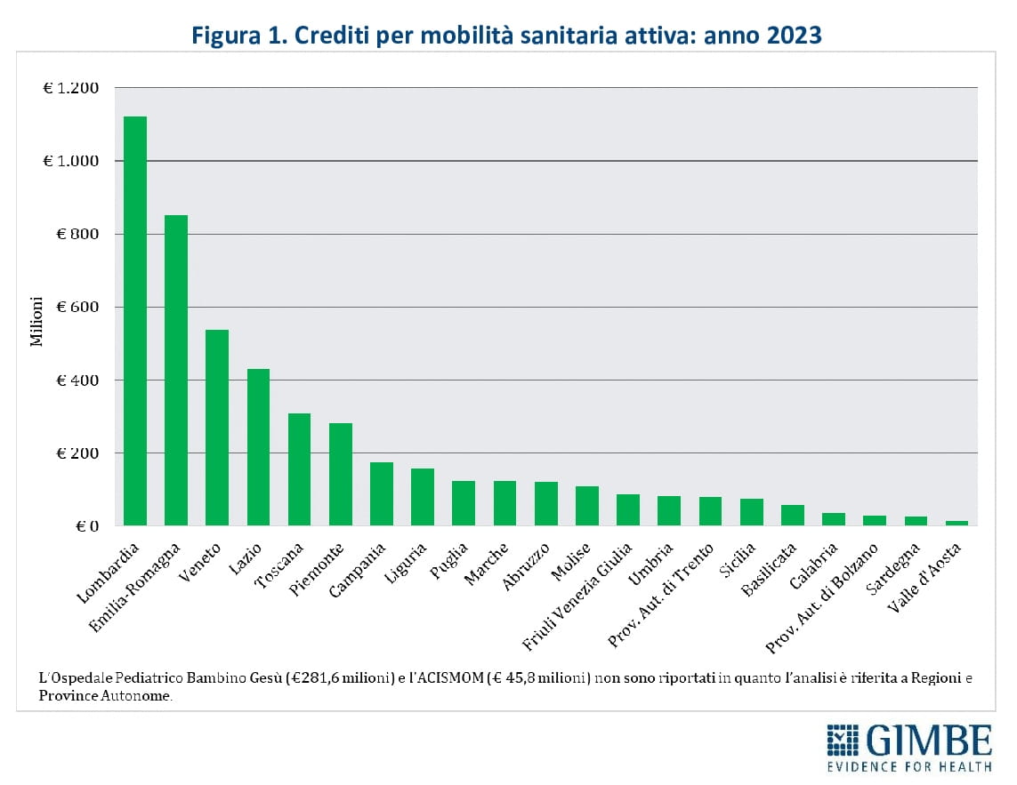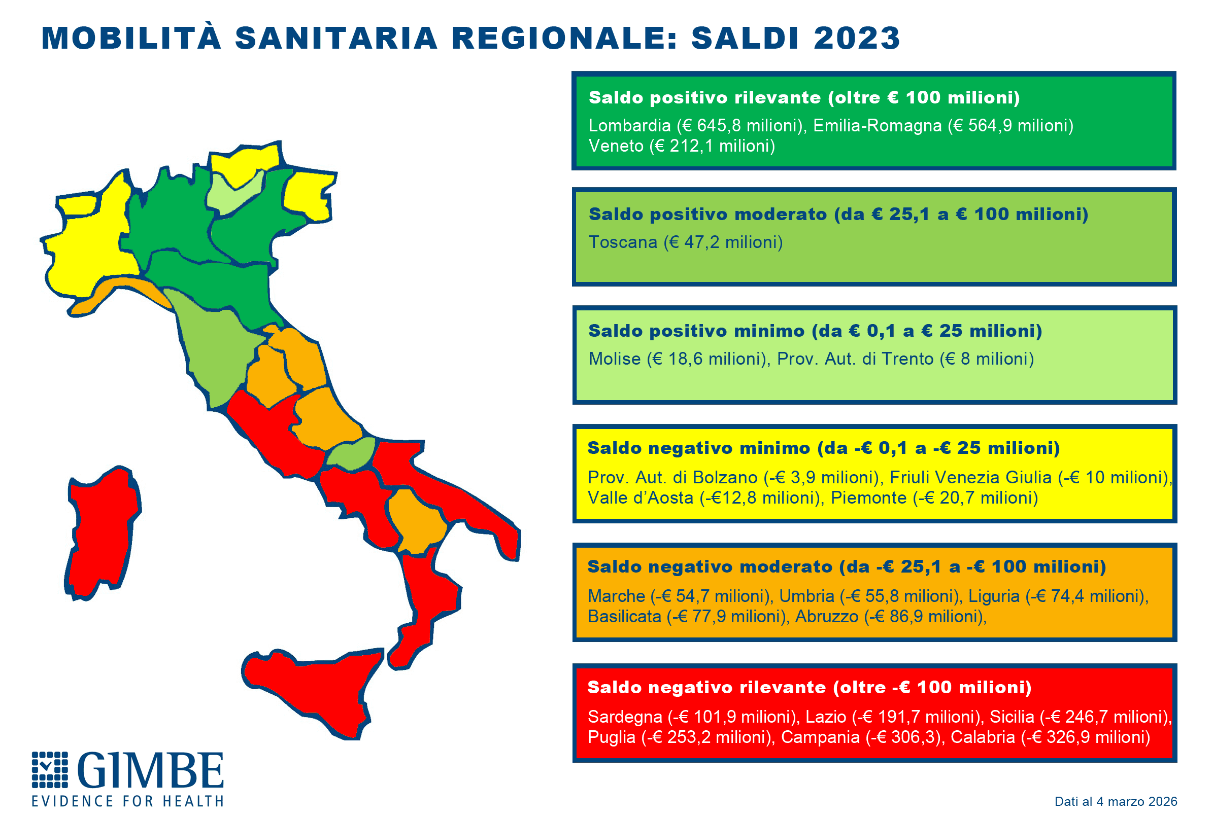 Nel 2023, la mobilità sanitaria interregionale ha raggiunto la cifra record di € 5,15 miliardi, il livello più alto di sempre, in aumento del 2,3% rispetto al 2022 (€ 5,04 miliardi). Le analisi della Fondazione GIMBE confermano il progressivo ampliamento dello squilibrio tra Nord e Sud, con un enorme flusso di risorse economiche in uscita dal Mezzogiorno verso il Nord. In particolare, verso Lombardia, Emilia-Romagna e Veneto, che si confermano le Regioni più attrattive.