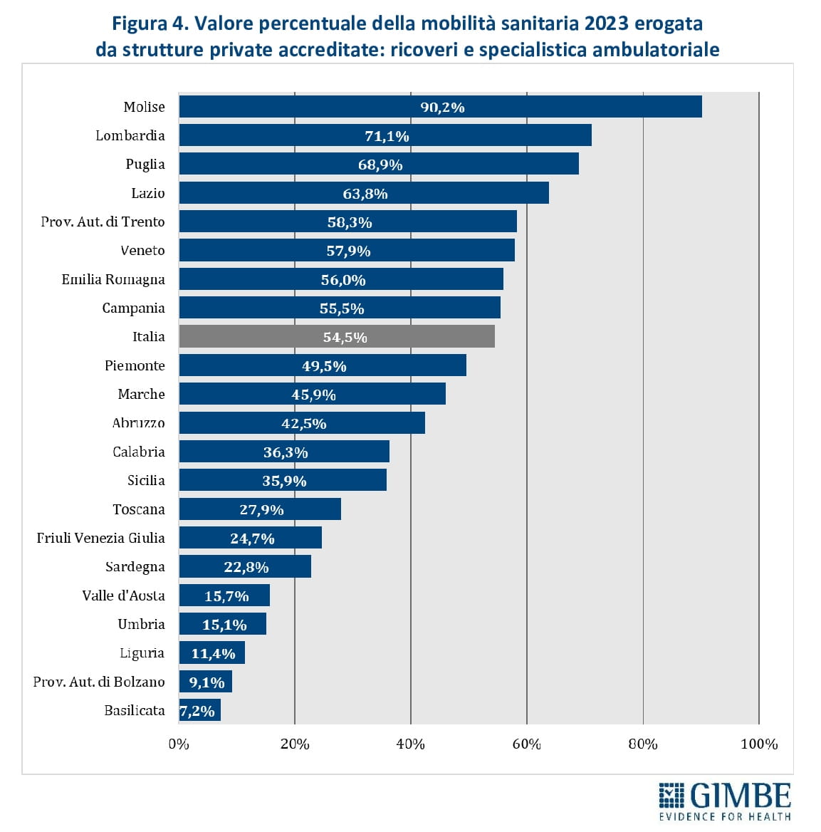 Il ruolo del privato convenzionato. Oltre 1 euro su 2 speso per ricoveri e prestazioni specialistiche erogate fuori Regione viene incassato dalla sanità privata convenzionata: € 1.966 milioni (54,5%), contro i € 1.643 milioni (45,5%) destinati alle strutture pubbliche. «La quota di mobilità che confluisce verso il privato convenzionato – sottolinea Cartabellotta – non è omogenea in tutte le Regioni, perché dipende dall’offerta e dalle capacità attrattive di strutture private d’eccellenza». Infatti, le strutture private assorbono oltre il 60% della mobilità attiva in Molise (90,2%), Lombardia (71,1%), Puglia (68,9%) e Lazio (63,8%). In altre Regioni la capacità attrattiva del privato resta invece inferiore al 20%: Valle D’Aosta (15,7%), Umbria (15,1%), Liguria (11,4%), Provincia autonoma di Bolzano (9,1%) e Basilicata (7,2%) (figura 4).