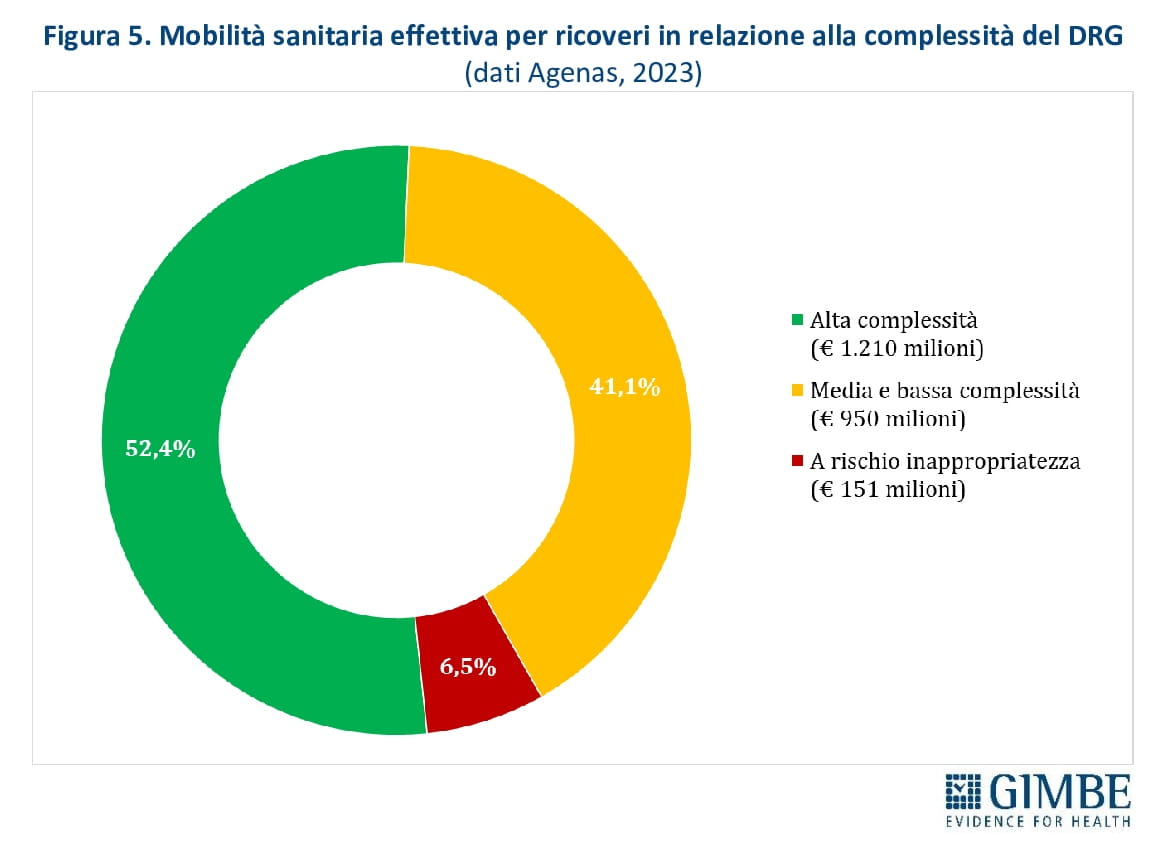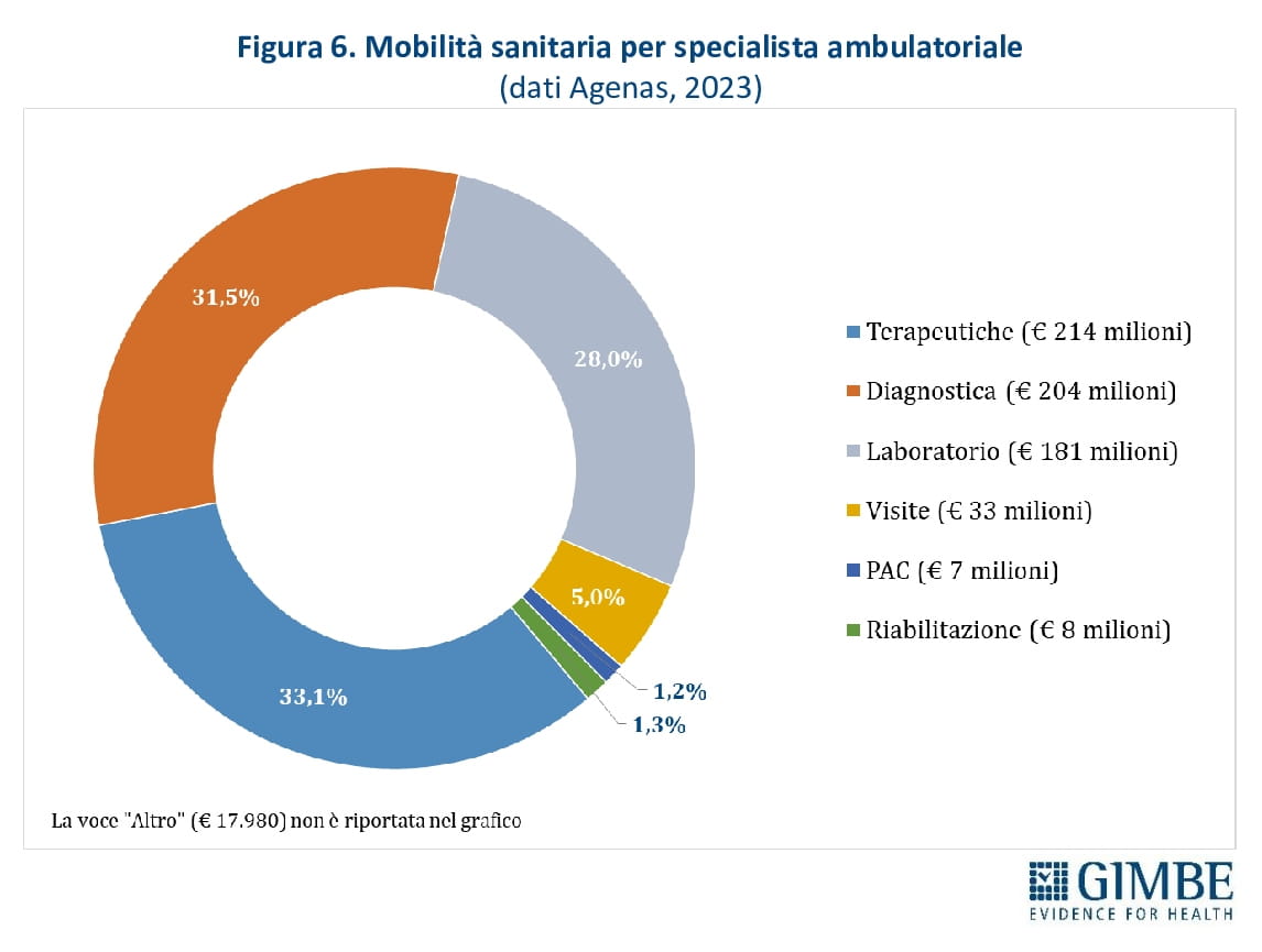 Ricoveri ospedalieri e specialistica ambulatoriale. Secondo i dati Agenas, l’80,4% della mobilità per ricoveri è classificato come effettiva (€ 2.311 milioni), ovvero dipende dalla scelta del paziente. Il 16,7% (€ 480 milioni) è invece legato a prestazioni urgenti (mobilità casuale) e il 3% (€ 85 milioni) riguarda casi in cui il domicilio del paziente non coincide con la Regione di residenza (mobilità apparente). Della mobilità effettiva, solo il 6,5% riguarda ricoveri ordinari a rischio di inappropriatezza (figura 5). Della specialistica ambulatoriale erogata in mobilità, quasi il 93% si concentra in tre categorie: prestazioni terapeutiche (33,1%), diagnostica strumentale (31,5%) e prestazioni di laboratorio (28%) (figura 6).