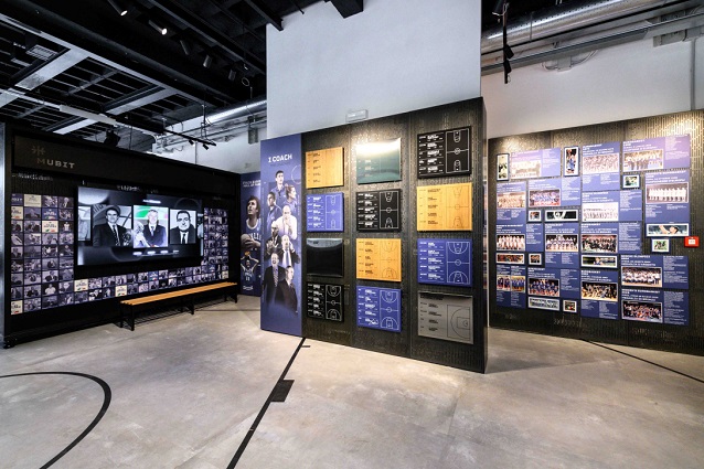 Le superfici espositive diventano strumenti narrativi: pareti che si animano attraverso proiezioni dinamiche e contenuti visivi capaci di restituire l’intensità delle grandi azioni della storia del basket. Le immagini scorrono e si intrecciano, creando un dialogo continuo tra passato e presente.