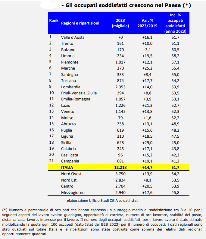 Da questa elaborazione è emerso che in Italia sono 12,2 milioni gli addetti che hanno dichiarato di “amare” il proprio lavoro, pari al 51,7 per cento del totale degli occupati presenti nel Paese.