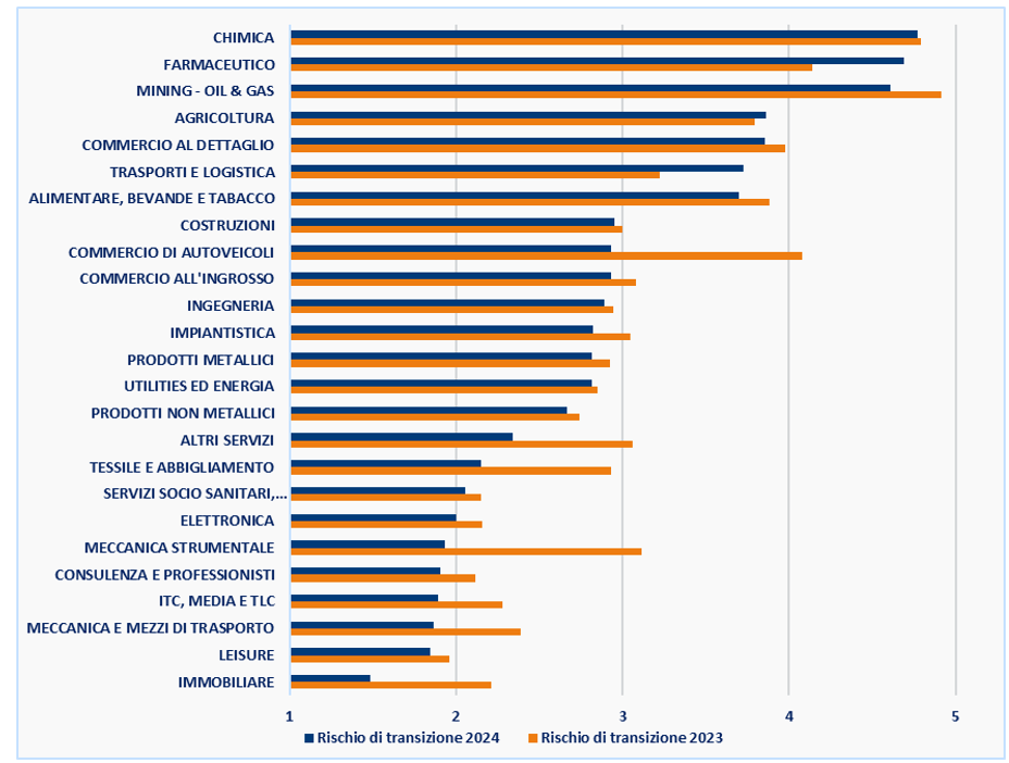 Permangono inoltre tra i settori più esposti la chimica, la farmaceutica e l’oil & gas: la farmaceutica è penalizzata dalle forti pressioni normative e dai costi elevati di riconversione dei processi produttivi, mentre nell’oil & gas si intravedono i primi segnali di miglioramento grazie alla riduzione dell’uso di combustibili fossili e all’aumento della produzione da fonti rinnovabili, pur restando uno dei comparti meno virtuosi.