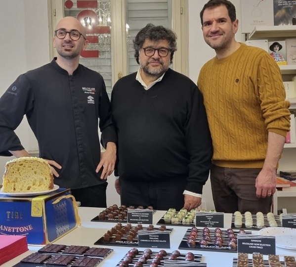 Nella foto, da sinistra: il maestro cioccolatiere Nicola Visceglia technical advisor di Puratos Italia, Antonio Pignatiello fondatore e amministratore della società di comunicazione Nevent, Alessandro Lanferdini titolare della libreria  UBIK di Modena.