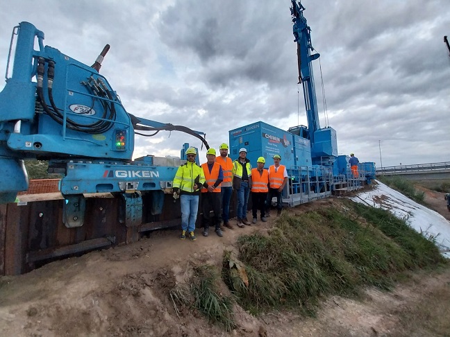 L’insieme dei macchinari, simile a un treno, lavora sulla sommità degli argini avanzando via via e appoggiandosi alle palancole già piantate; per partire è stato necessario, quindi, infiggere una prima serie per una lunghezza sufficiente da consentire di installare tutte le componenti. Ora, con il sistema al completo, si sta procedendo all’infissione dei primi 450 metri di palancole (un centinaio di metri quelli realizzati sinora), per poi passare ai successivi 750 metri. L’infissione statica, o infissione a pressione, avviene senza emissioni di vibrazioni e con basse emissioni rumorose. I macchinari vengono utilizzati dalla ditta italiana esecutrice dei lavori, appaltati dall’Agenzia regionale per la Sicurezza territoriale e la Protezione civile (ufficio di Ravenna).