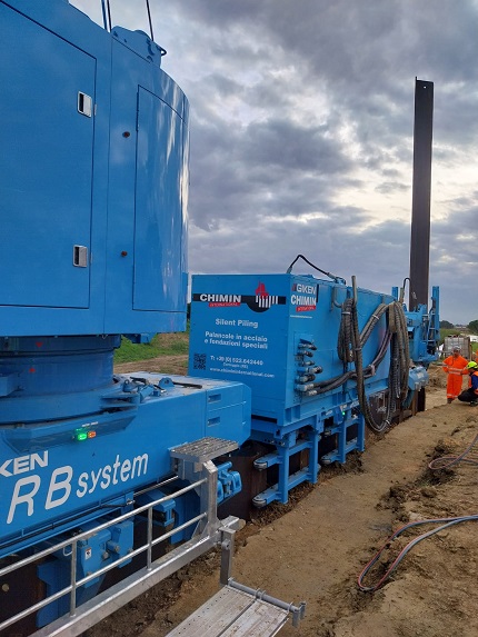 (Sesto Potere) – Bagnacavallo (Ra) – 29 novembre 2025 – Un insieme complesso di macchinari, tra cui un particolare tipo di pressa idraulica a zero vibrazioni e bassa rumorosità, il ‘Silent Piler’, fabbricato dall’azienda giapponese Giken. È quello che sta lavorando, per l’infissione delle palancole d’acciaio, nel cantiere lungo l’argine sinistro del fiume Lamone, a Villanova di Bagnacavallo, nel ravennate: si tratta dell’unico sistema (a ‘treno’) nel suo genere a essere utilizzato attualmente in Europa.