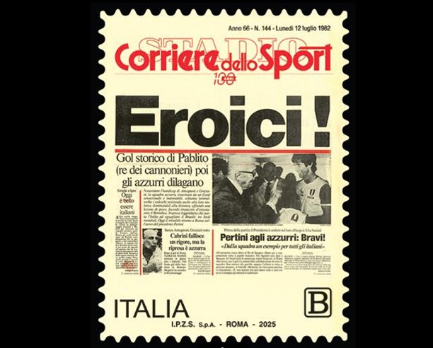 La vignetta riproduce un particolare della prima pagina de il corriere dello sport che celebra la grande vittoria della nazionale italiana ai Campionati Mondiali di Calcio in spagna del 1982, andata in edicola il 12 luglio di quell’anno indimenticabile del quotidiano sportivo. In alto spicca il logo de centenario della famosa testata giornalistica italiana.