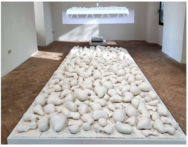 Utilizzando la risonanza magnetica funzionale (fMRI), l’artista analizza la propria attività cerebrale sotto stimolo della fame, sviluppando modelli tridimensionali che sono stati stampati in 3D e trasformati in sculture in ceramica. Le opere poggiano su piastrelle fatte a mano che rappresentano sezioni del cervello dell’artista, evocando sia la vulnerabilità biologica che il collasso sociale prodotto dalla disuguaglianza. Uno schermo mostra il conteggio in tempo reale delle vittime della fame – vite ridotte a numeri – mentre la prima parte, il primo capitolo del suo nuovo film World of Plenty, presentato in anteprima, è caratterizzata dal suono delle gocce che cadono e segnano il passare del tempo. L’installazione fonde l’esperienza personale e quella collettiva, spostando lo spettatore dalla percezione individuale alla consapevolezza condivisa, rendendo impossibile ignorare la crisi della fame.