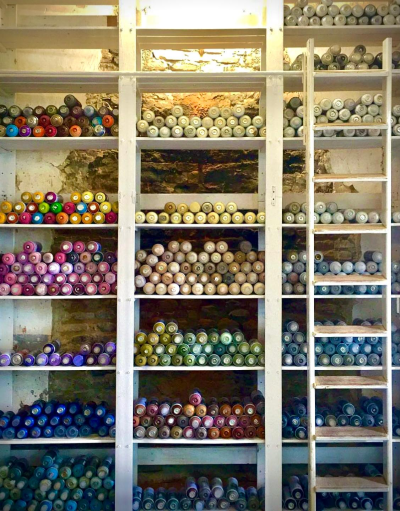 Proprio in occasione della partecipazione al progetto, l’artista ha pensato di regalare loro le bombolette – alcune nuove, altre che non usa più – e le altre dotazioni, dal momento che era in procinto di trasferire temporaneamente il suo deposito al Musas.