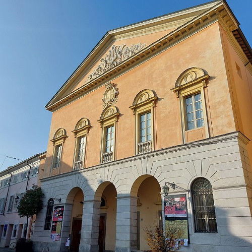 (Sesto Potere) – Fidenza (Pr) – 27 gennaio 2026 – La facciata neoclassica scandita da un portico a tre arcate sopra il quale si aprono cinque finestre sormontate da lunette che ospitano medaglioni con busti di musicisti e compositori. Lo stemma di Fidenza sopra la finestra centrale. Il foyer rivestito di stucchi a finto marmo decorato con fregi, maschere e putti, e al centro della volta due figure femminili simboleggianti la Musica e la Poesia. L’elegantissima sala degli spettacoli, a tre ordini di palchi, con uno sfarzoso boccascena arricchito da oro e stucchi bianchi. La volta affrescata su fondo azzurro, da cui si sporgono verso gli spettatori giocosi amorini e putti.