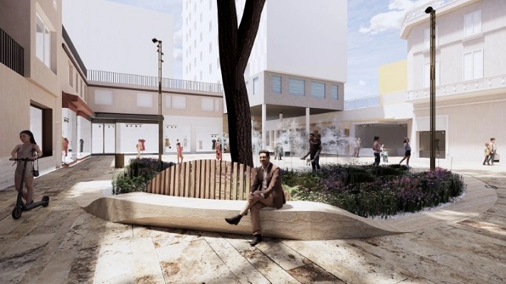 Grande attenzione è stata posta al comfort e alla sosta. Il progetto prevede l’installazione di sedute scultoree in pietra dalle forme fluide e sinuose che sembrano nascere dal terreno, alcune delle quali impreziosite da schienali in listelli di legno per un tocco di calore materico. Questi elementi saranno immersi in ampie aiuole ricche di vegetazione mediterranea e fiori, che abbracceranno i pini esistenti, integrando perfettamente la natura nel contesto urbano. Non si tratterà solo di un luogo di passaggio, ma di una vera e propria “agorà” dotata di una forte identità visiva.