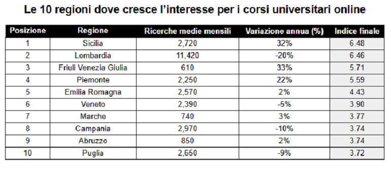Con un volume medio di ricerche mensili di 2.720 e un +32% YoY, la Sicilia è prima in classifica: interesse probabilmente spinto dalla domanda di flessibilità educativa nelle aree meno servite da università tradizionali.