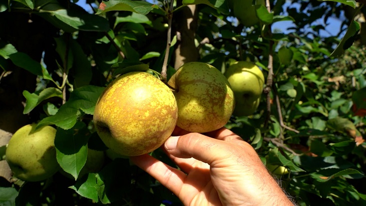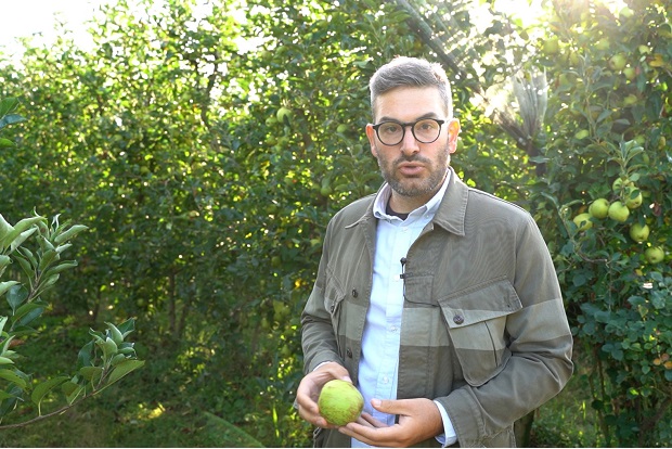 L’agronomo Andrea Proni ha accompagnato gli spettatori in campo, tra i filari di mele in raccolta ed ha mostrato i frutti di Rugginosa di Romagna. “Abbiamo selezionato questa mela nel tempo, partendo dalla Golden ma poi è il territorio a conferirle il suo aspetto tipico, grazie all’umidità e alla presenza di lieviti in fioritura. Per ottenere il giusto numero di frutti sulla pianta, in primavera si esegue un diradamento meccanico, affinato poi manualmente sui frutticini. La rugginosità rende il frutto più resistente a molte malattie fungine e ci permette di ridurre i trattamenti, ottenendo un prodotto più sano e più sostenibile.”